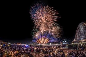 港町の開放的な空間で、音楽とシンクロした花火と静寂の中で打ちあがる花火の